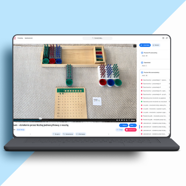 Po zakończeniu kursu otrzymujesz 365 dni dostępu do platformy szkoleniowej, na której znajdziesz prezentacje pomocy Montessori wykorzystywanych w programie szkolnym, opisy ich zastosowania oraz dodatkowe materiały wspierające Twoją codzienną pracę z dziećmi.