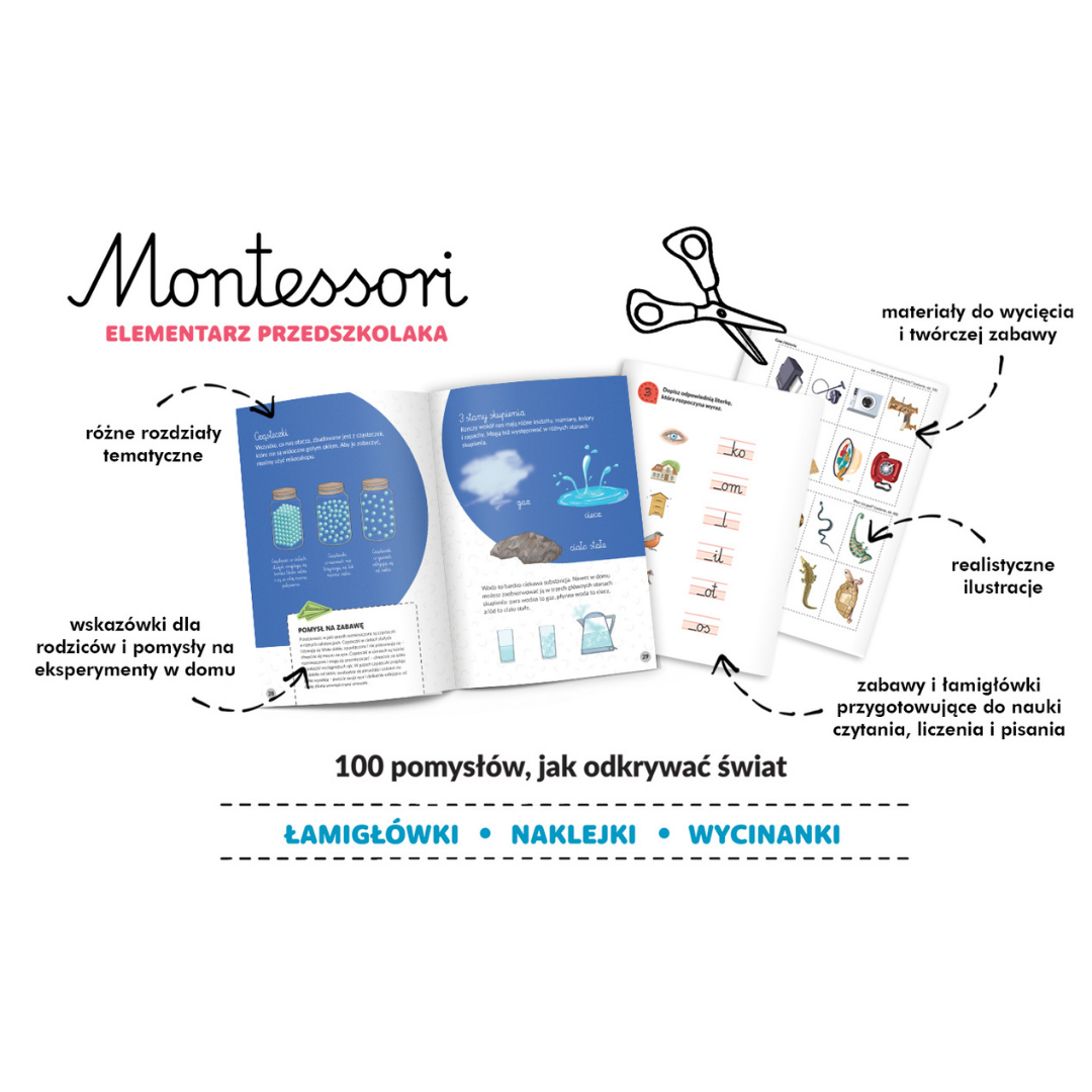 Elementarz Montessori skierowany jest do dzieci w wieku od 4 do 6 lat. Jest niezastąpionym narzędziem w edukacji Twojego dziecka. Stworzony z myślą o pedagogice Montessori. Elementarz łączy naukę z zabawą, zachęcając do samodzielnego odkrywania i eksploracji świata.